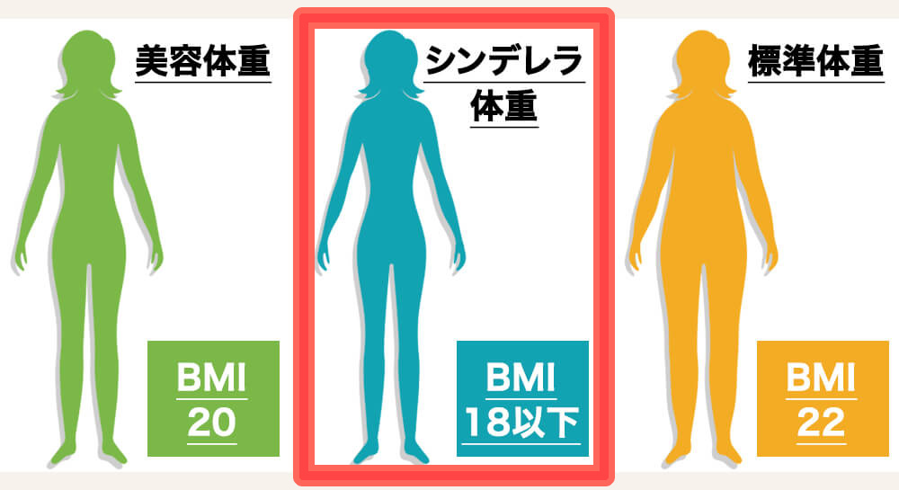 シンデレラ体重はBMI 18以下で、標準体重よりも9〜11kgほど少なく、見た目は痩せすぎという印象です