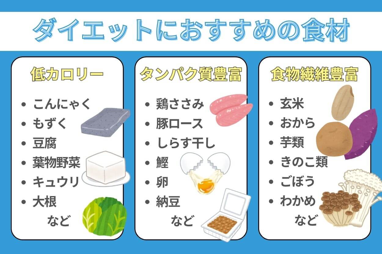 運動なしのダイエットでは、低カロリー食材、タンパク質・食物繊維豊富な食材を積極的にとりましょう。