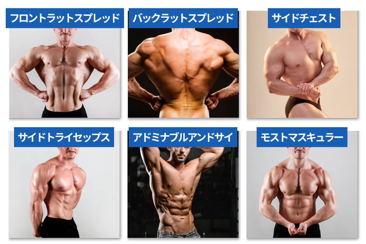 ボディビルの大会では、ダブルバイセップス以外にもさまざまなポージングがあります。