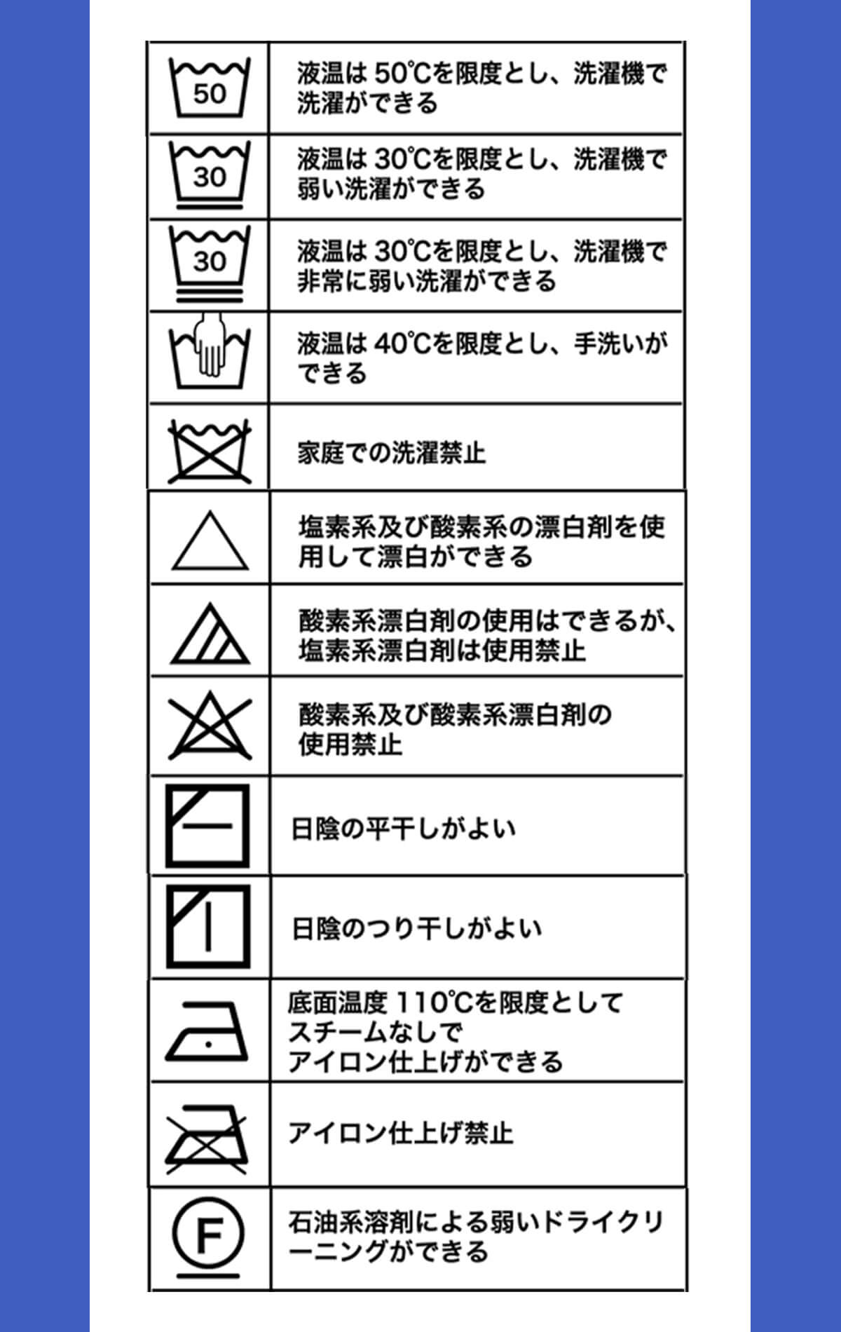 サウナスーツの洗濯表示タグに多く見られるマークとその意味は、以下の通りです。