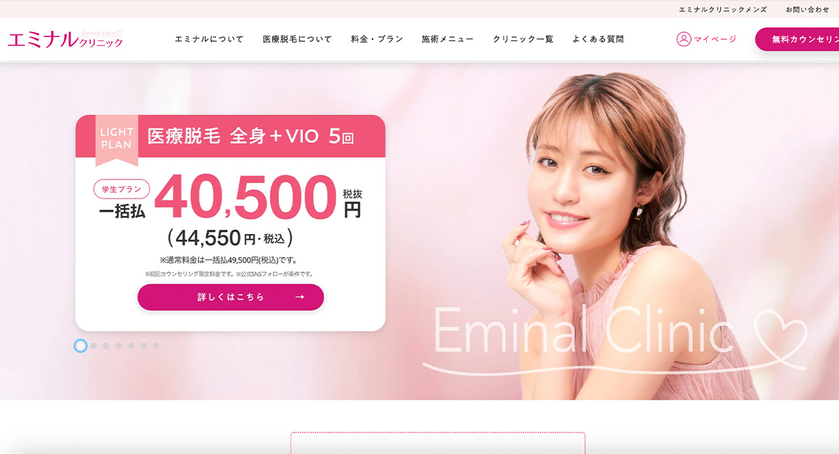 厚生労働省に認可されたレーザー脱毛機器のみを使用して、VIOや顔、襟足、全身に医療脱毛の施術を行います。高い技術を持つ看護師が脱毛施術を行うこと、1回で複数部位の施術を受けられることなどのメリットがあります。